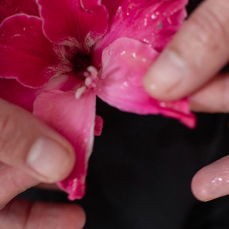Des doigts la touchent, l’ouvrent, l’approchent. Ces gestes peuvent sembler doux… mais le cadre est serré, le flou inquiète, la fleur se plie.