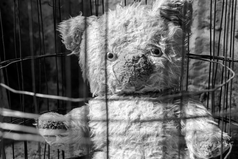 Le nounours en peluche, abîmé, prisonnier d’une cage ou serré par une main d’enfant, devient l’emblème de l’innocence détruite.